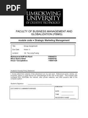CENTRE FOR POST GRADUATE STUDIES Limkokwing University of Creative Technology Students are supposed to meet the submission deadline. Limkokwing Official Assignment Cover Page Assessment Criteria This assignment carries 50 marks which contributes 10 to the total marks of the final assessment of this module. View Individual Assignment Cover page 1docx from MBF 1223 at Limkokwing University of Creative Technology Cyberjaya.